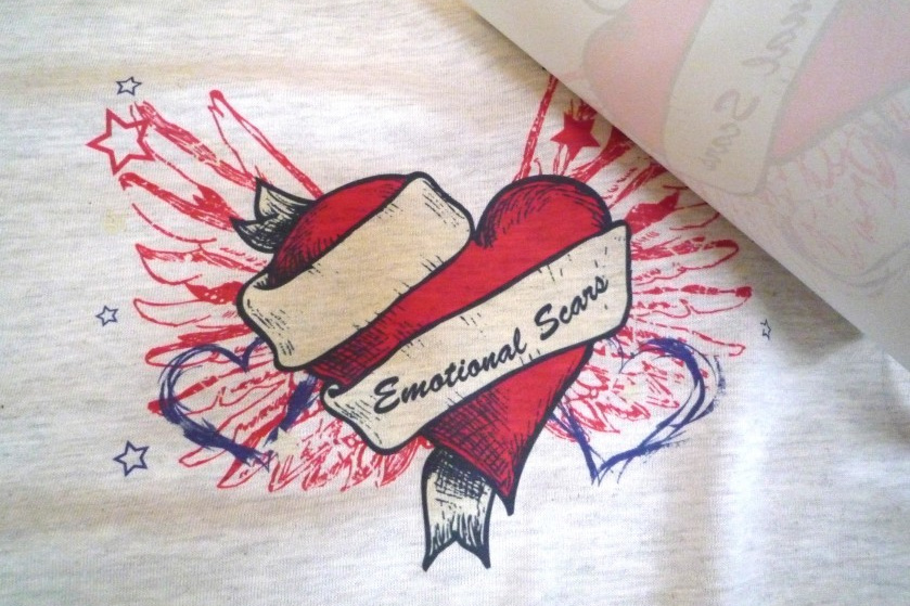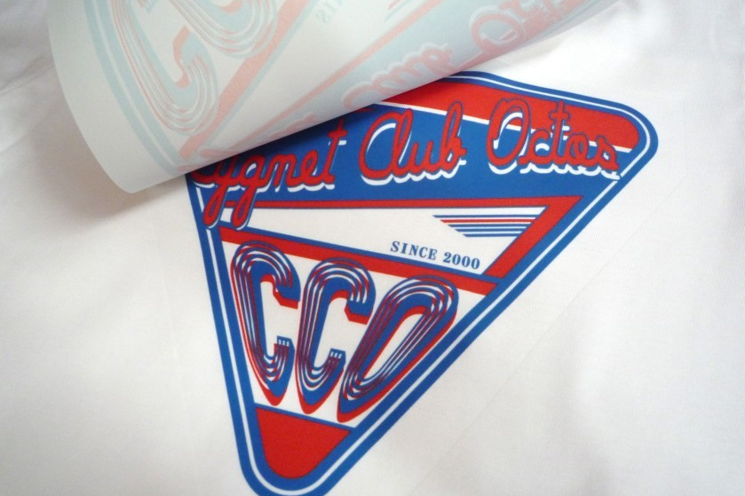 絵柄を転写紙に昇華インクでプリント。パウダー付着。絵柄のみ圧着転写。